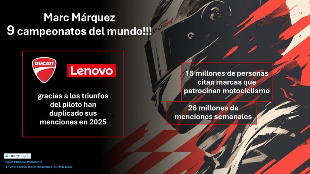 El motociclismo es uno de los deportes donde mayor notoriedad alcanzan las marcas patrocinadoras. En el TOP OF MIND de patrocinio que realiza IMOP Insights de forma continua, se muestra cómo 15 millones de personas recuerdan alguna marca relacionada con el patrocinio del mundial de motociclismo y se obtienen 26 millones de menciones semanales. Un recuerdo que muestra un perfil masculino y más notorio entre los sectores más jóvenes de la población, por debajo de 45 años.